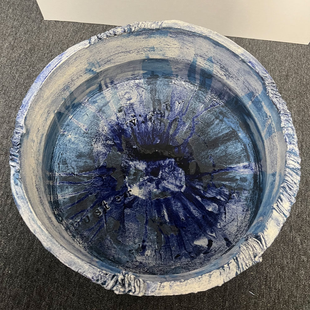 Grafikk på porselen. Diamenter 45cm. Høyde 25cm.